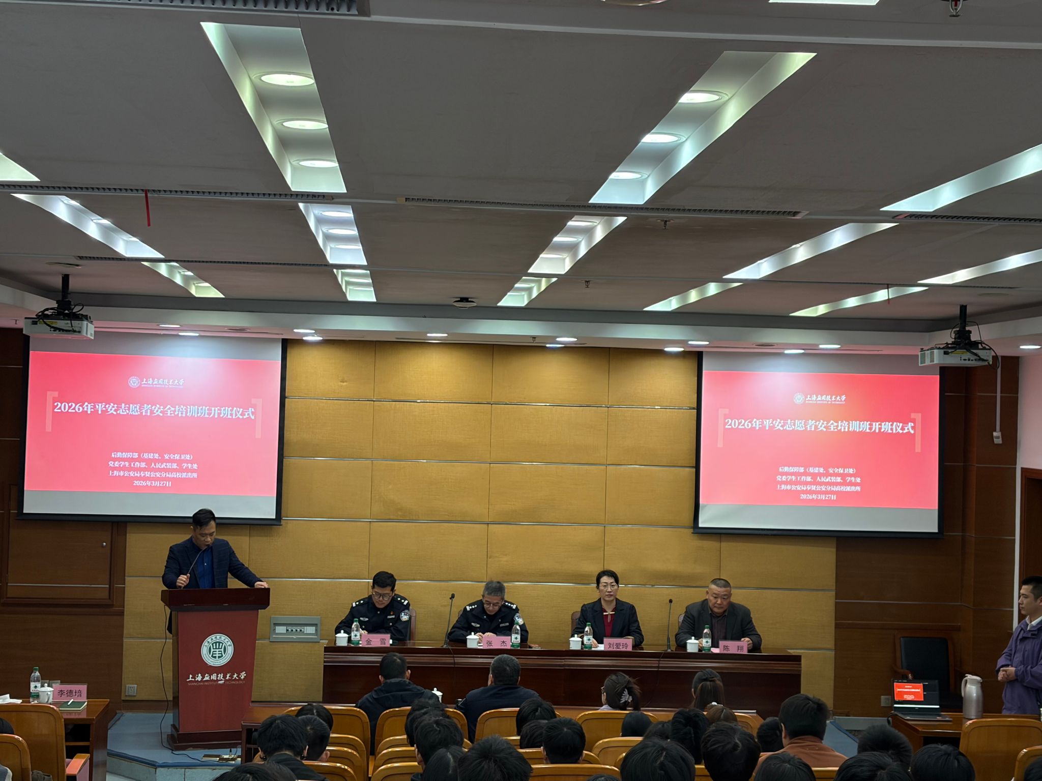 为深入贯彻落实总体国家安全观,迎接第11个全民国家安全教育日,充分发挥大学生平安志愿者在平安校园建设中的积极作用,切实提升校园安全文明水平,筑牢校园安全防线,3月27日,学校后勤保障部(基建处、安全保卫处)、党委学生工作部与上海市公安局奉贤分局高校派出所,联合举办2026年平安志愿者安全培训班。上海市公安局奉贤分局高校派出所所长张杰、副所长金雪,安全保卫处处长刘爱玲,党委学生工作部副部长陈翔出席开班仪式。开班仪式由安全保卫处副处长李德培主持。