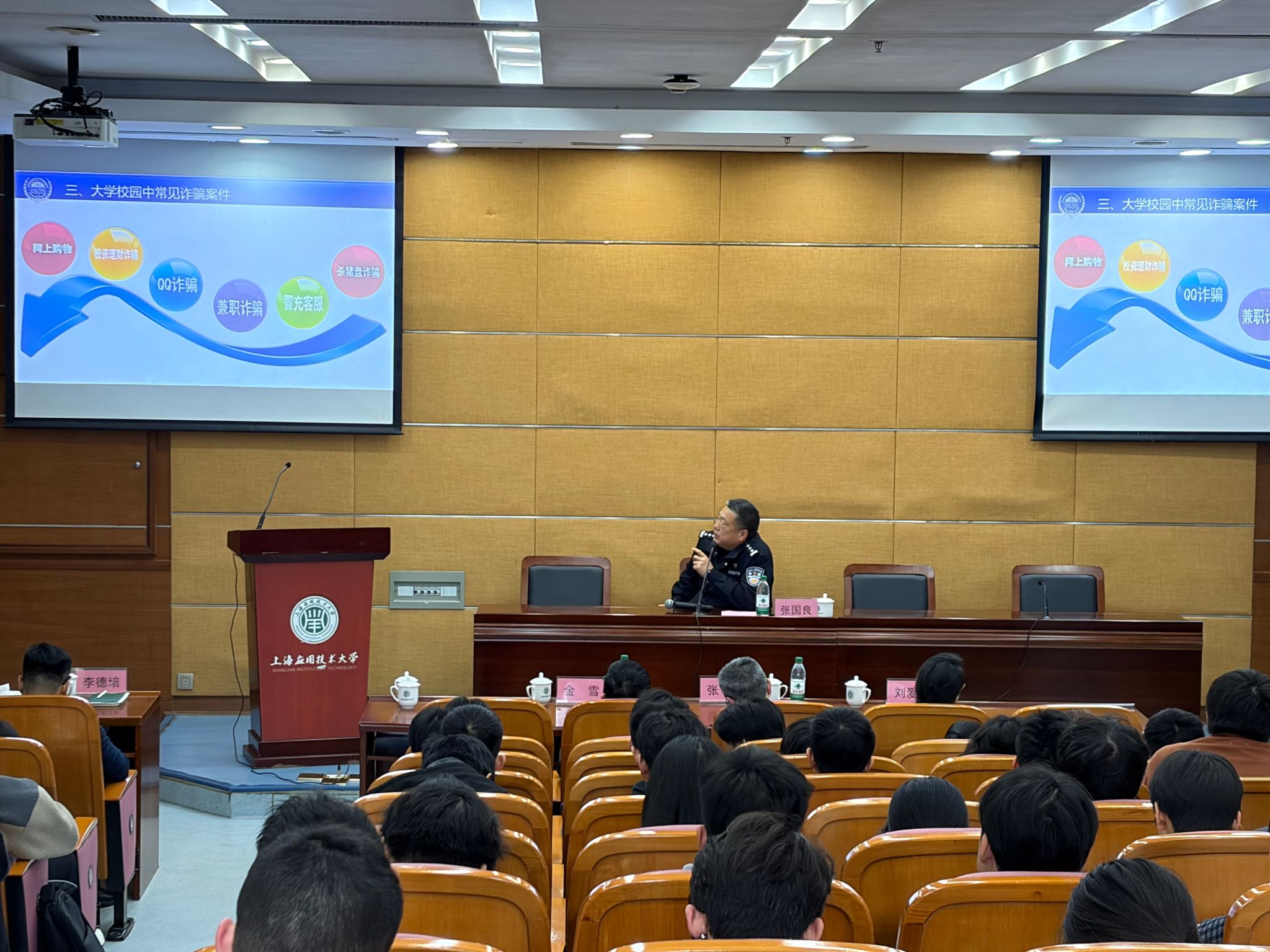 安全讲座第一课由上海市公安局奉贤分局高校派出所警官张国良主讲。张警官以反诈宣传为主题,结合校园典型案例,深入剖析刷单诈骗的隐蔽性和危害性,帮助同学们清晰识别诈骗手段,切实提升反诈防骗意识。同时,张警长对其他治安类事件、高空抛物危害、低慢小航空器飞行条件等做了解读。