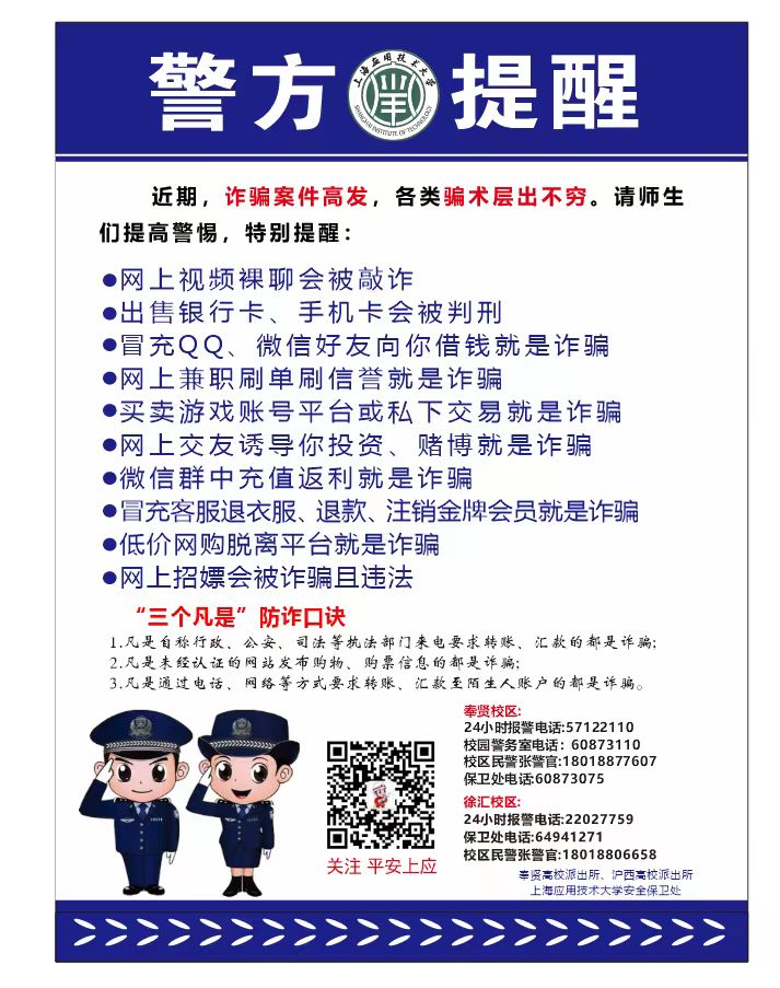 告知同学们遇到任何人身安全问题,或是发现校园中存在的安全隐患,都可以随时拨打保卫处24小时值班电话60873075、校园“110”报警电话60873110;徐汇校区可拨打:64941296。