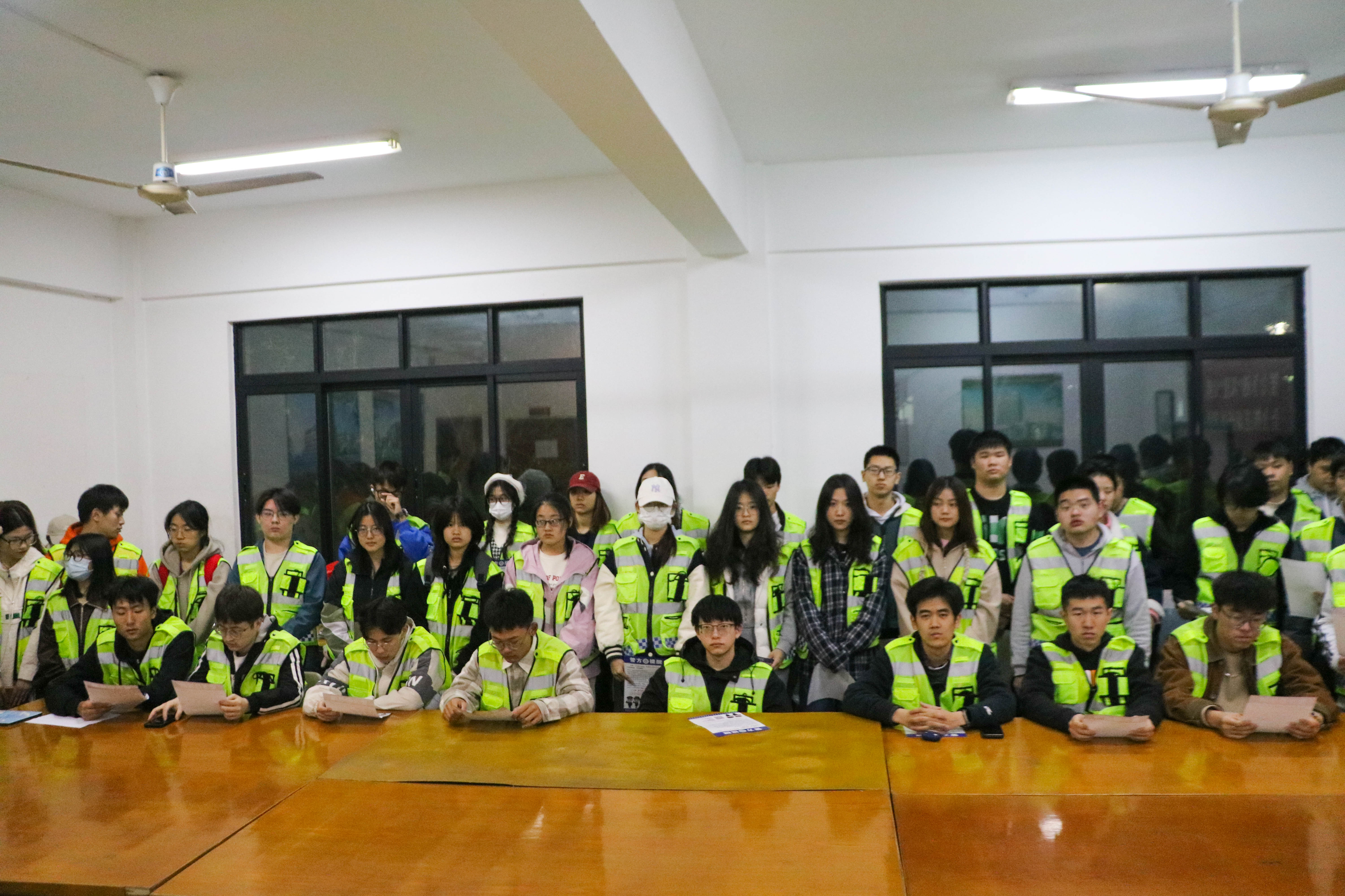 平安志愿者们在保卫处集合签到,统一进行线下培训,主要包括:活动的背景、意义以及宣传方式、宣传内容、职责分工等。平安志愿者们身着荧光马甲,按照各自任务,以小组为单位出发前往对应学生公寓。